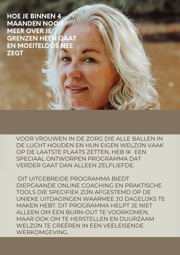 Mijn missie is om vrouwen in de zorg die voortdurend balanceren tussen hoge werkdruk en hun verantwoordelijkheden thuis te helpen om in slechts 4 maanden tijd te leren: